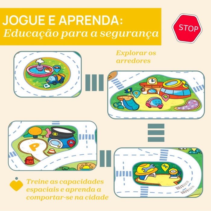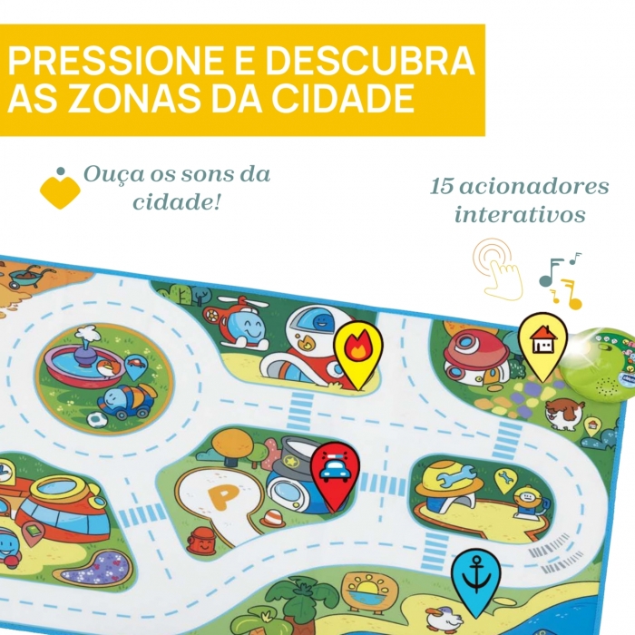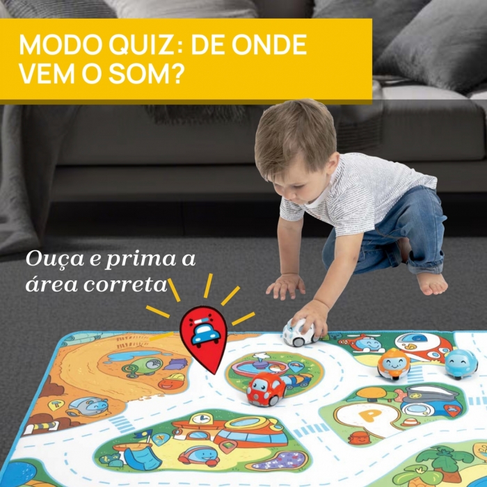 • 2 modos de jogo evolutivos: 1. explore a cidade com as suas mãos e pés. 2. MODO QUIZ: ouça os sons e pressione o gatilho correspondente no tapete de jogo!