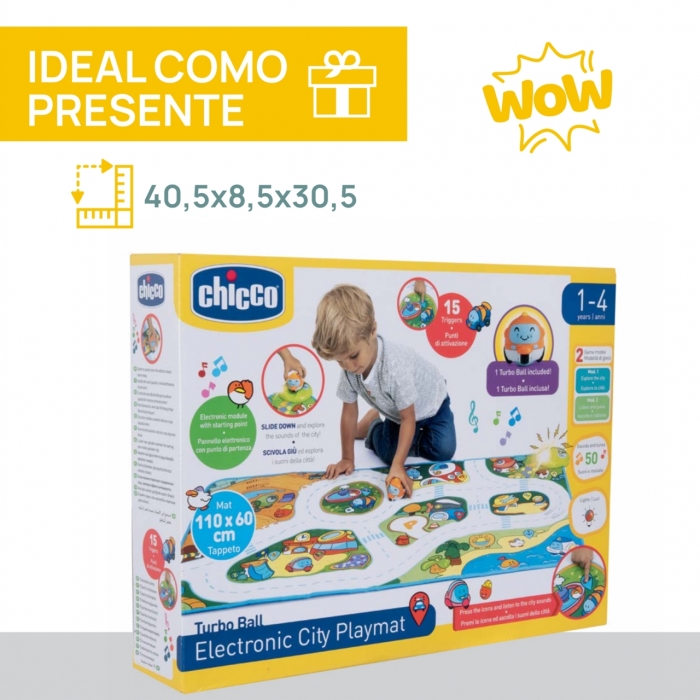 • Tapete de jogo eletrónico com um Turbo ball incluído, com sons reais da cidade e um divertido questionário!